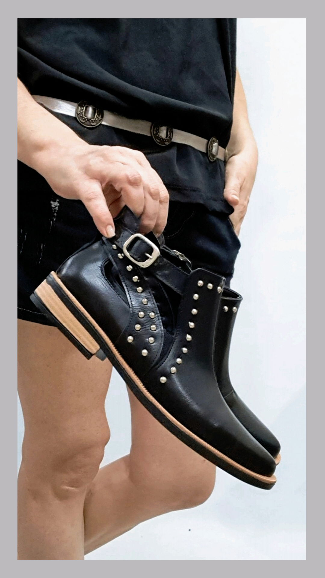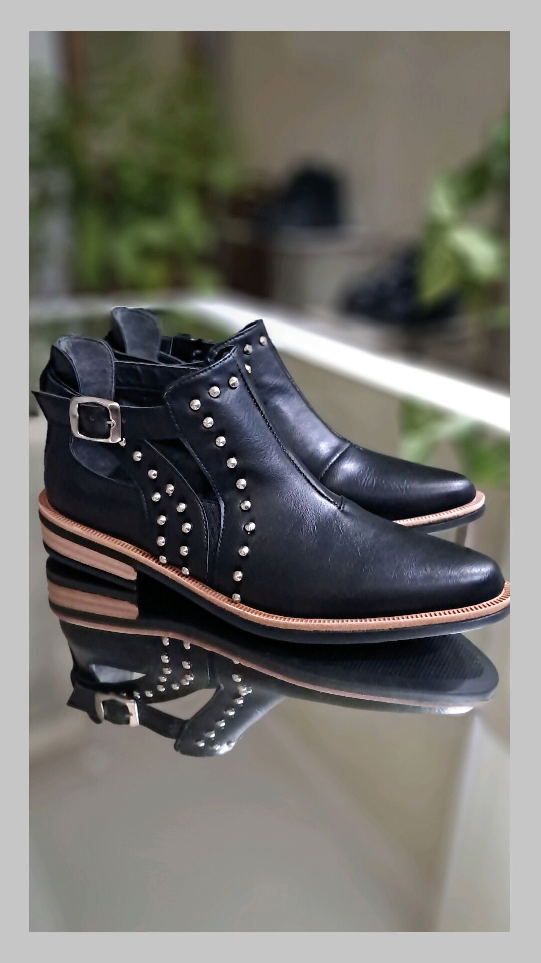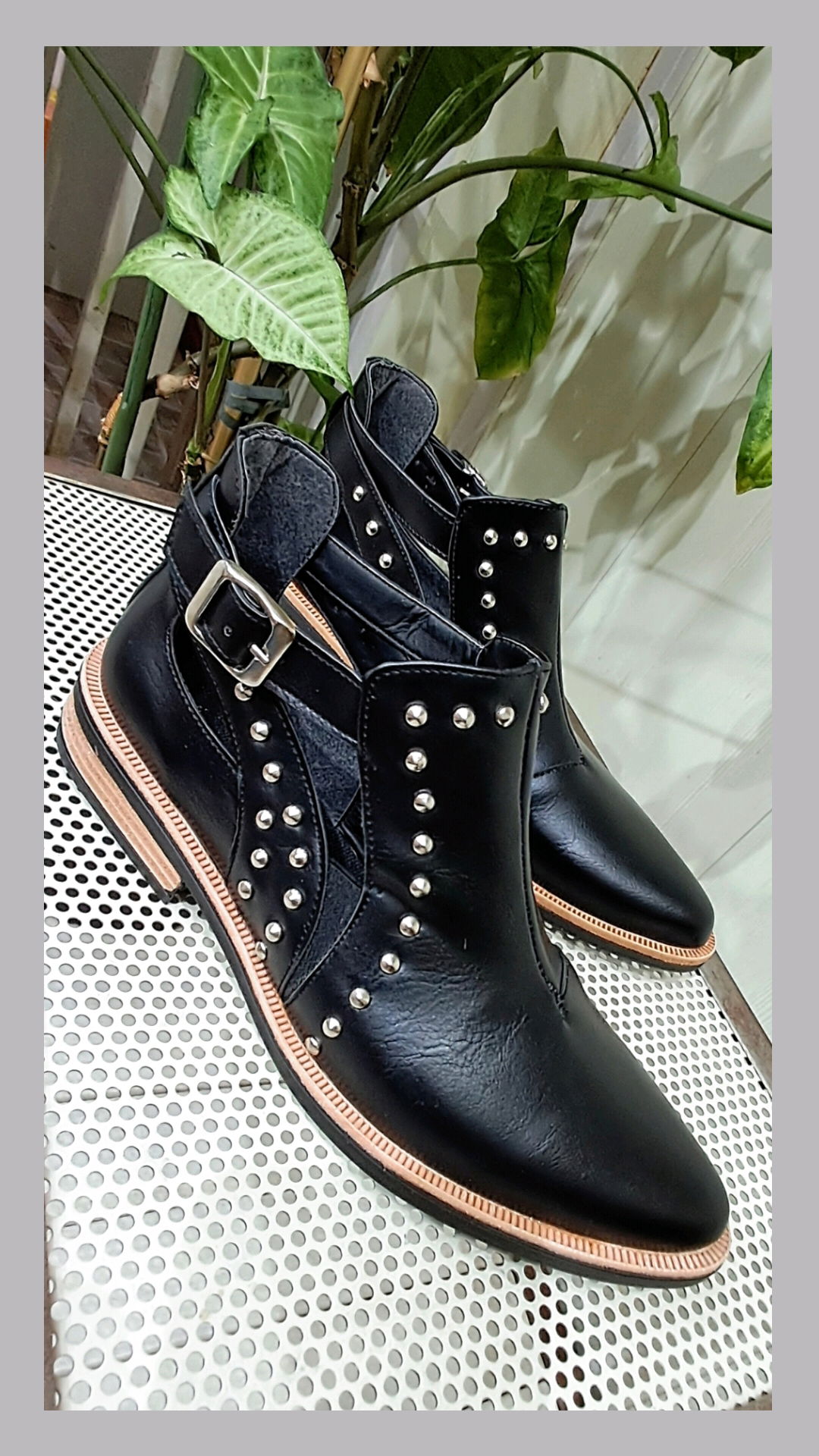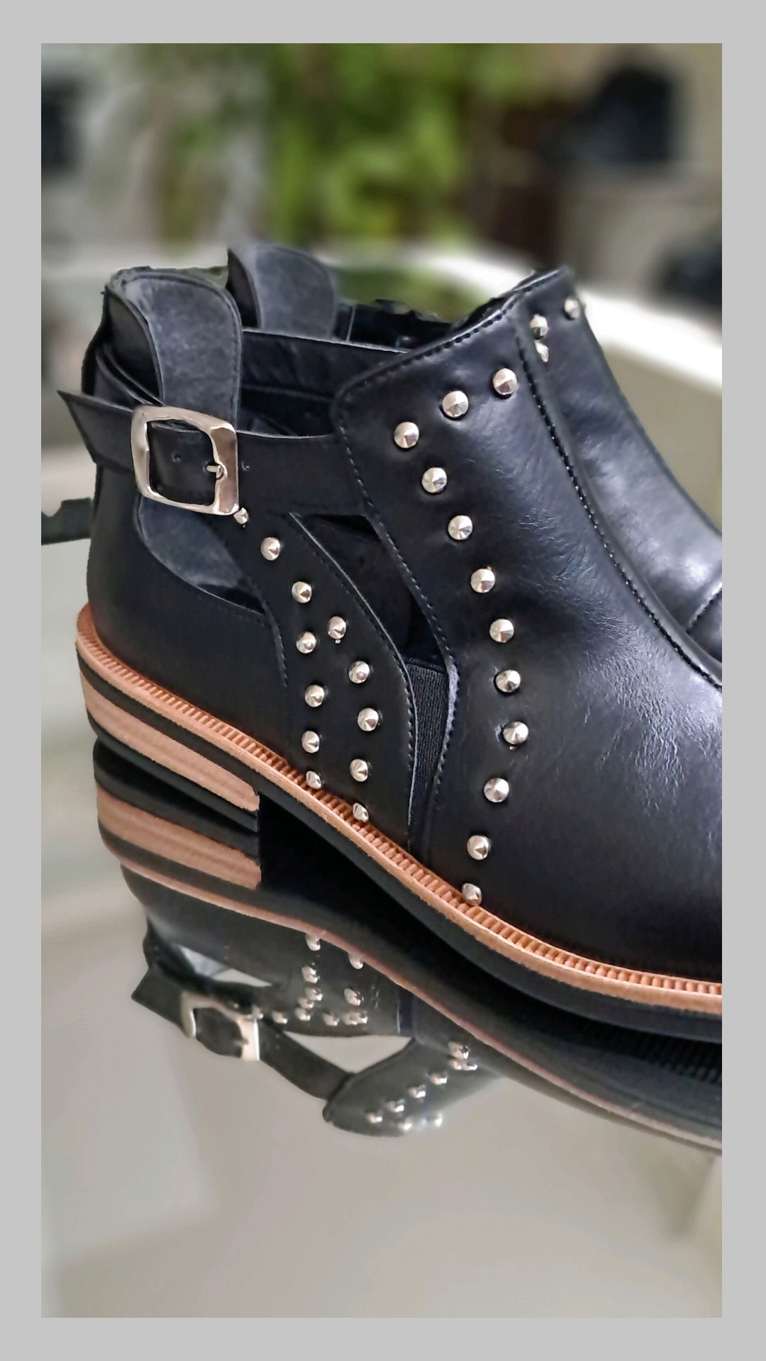 Bota ecocuero corta con hebillas y detalles de tachas .