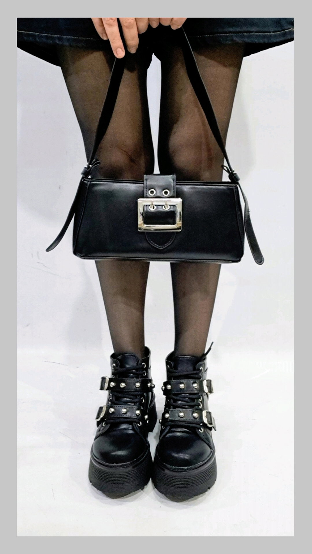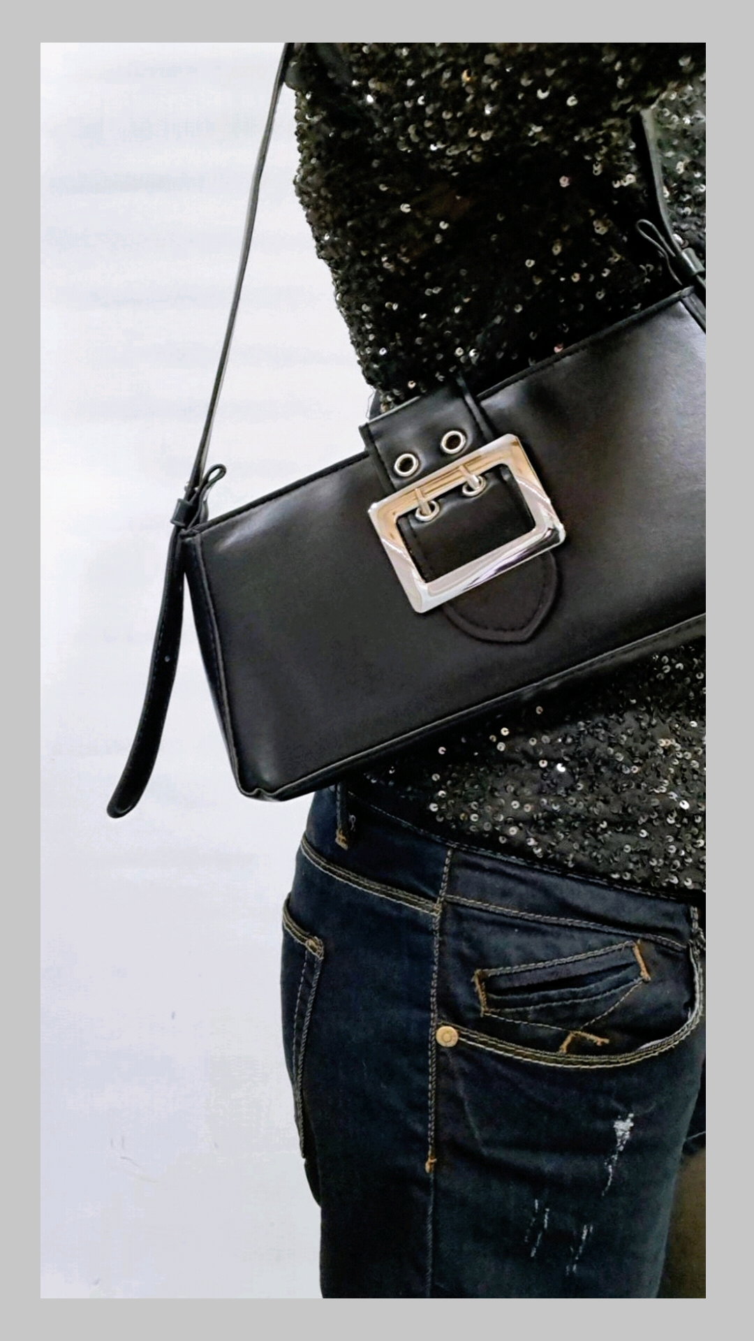 Minibag ecocuero con correa regulable, cierre interno. Incluye pañuelo como accesorio. Medidas alto: 12 cm/ ancho: 26 cm./ base: 5 cm.