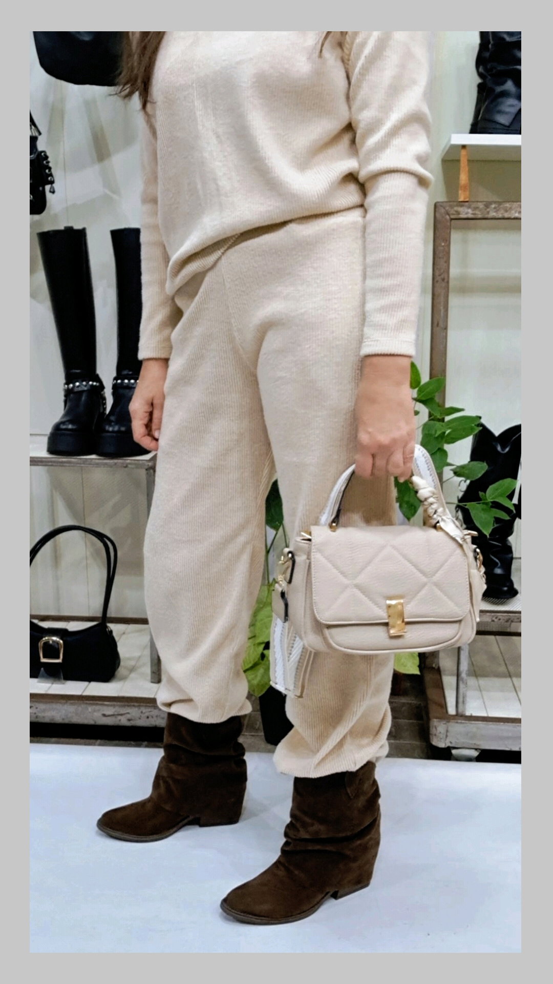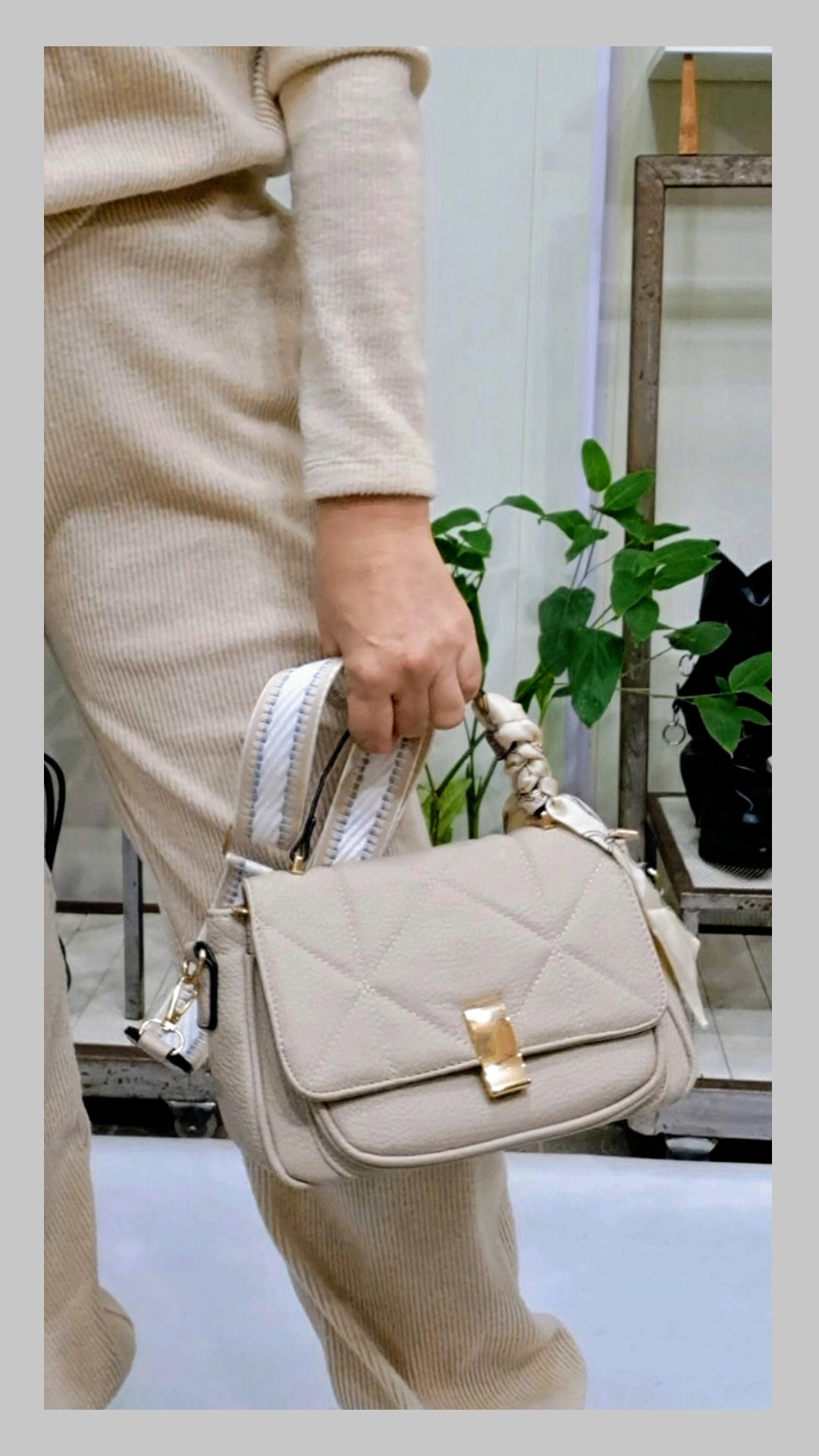 Minibag ecocuero visión. Tapa matelassé y broche imán. Tiene correa tejida desmontable y lazo de seda como accesorio.