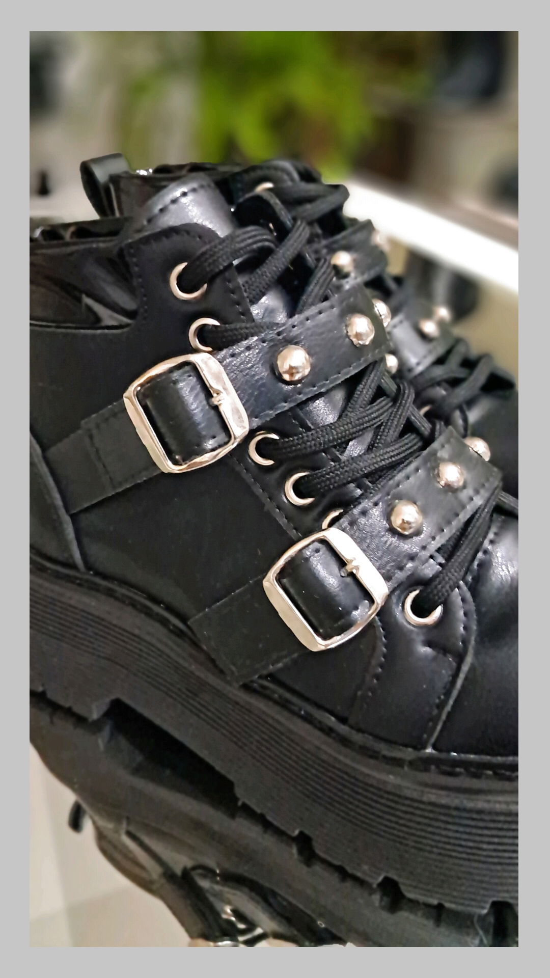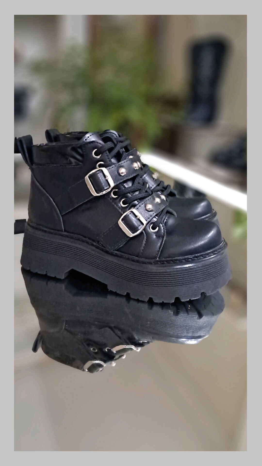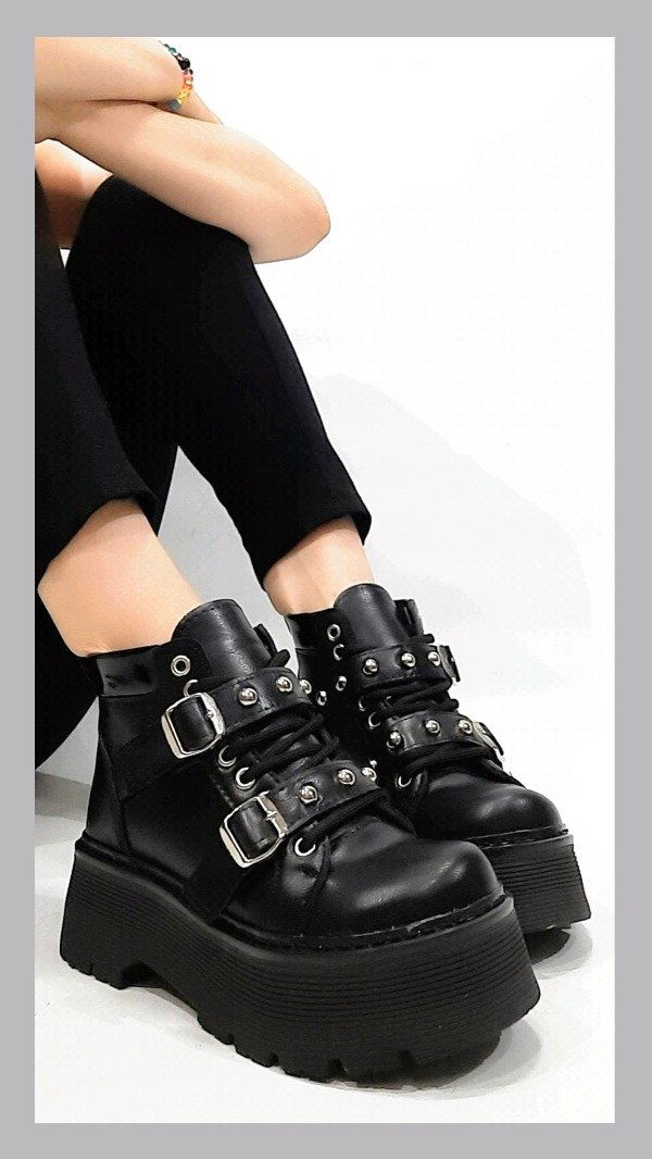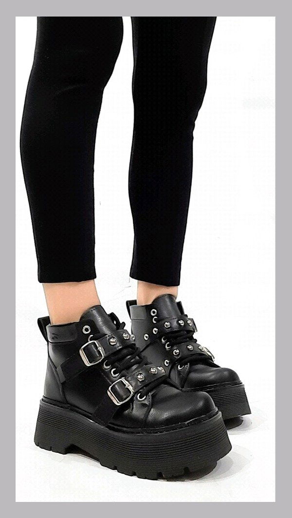 Borcegos ecocuero con plataformas. Acordonado y hebillas con tachas. Horma normal.
