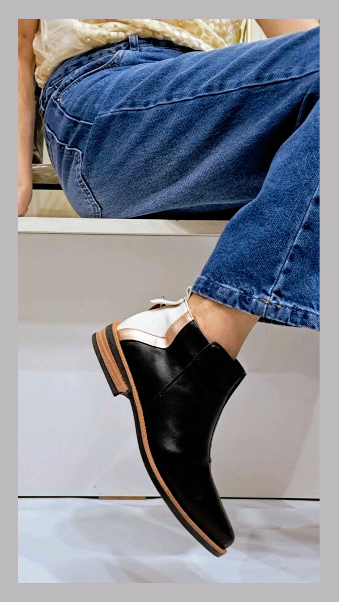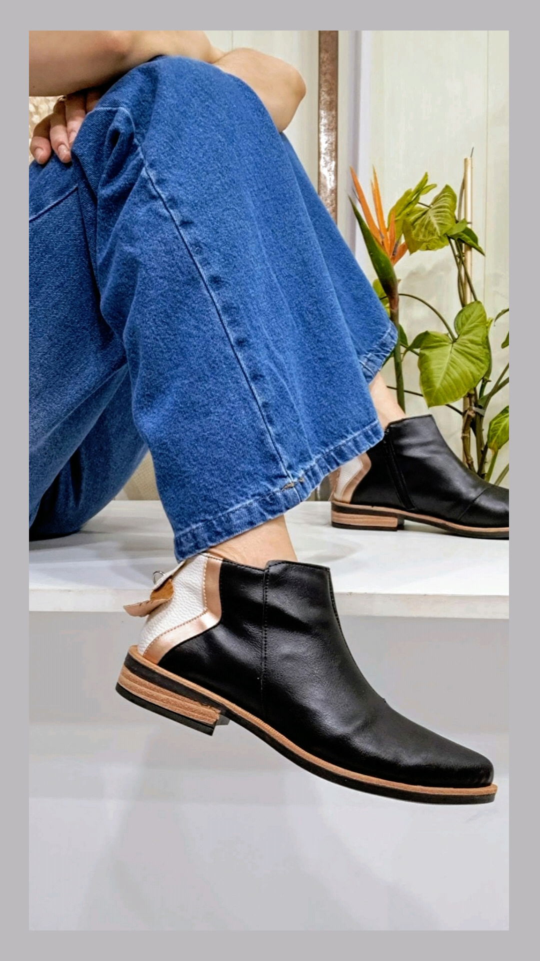 Bota corta ecocuero combinadas en color crudo y oro en la talonera, taco folia.