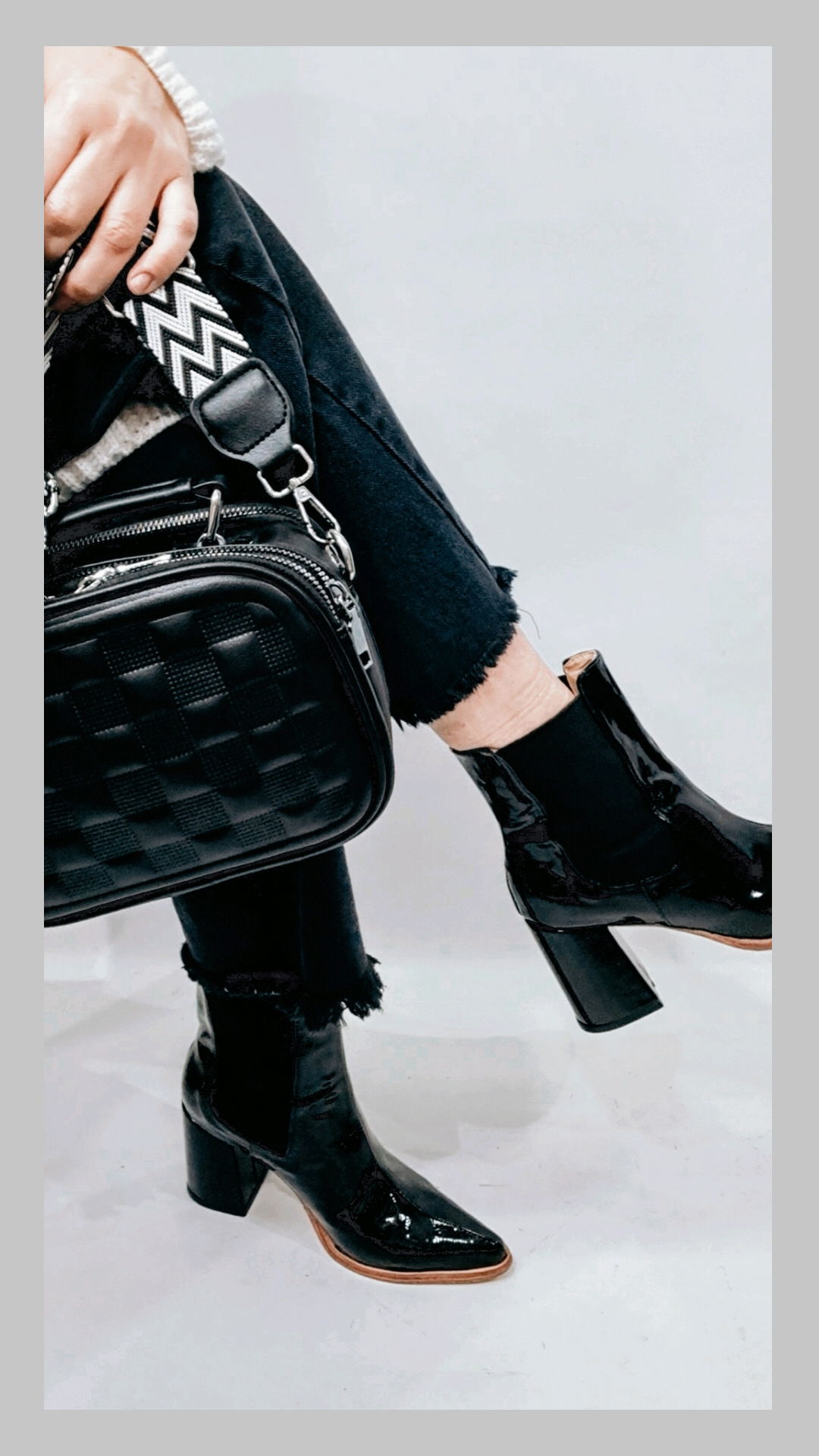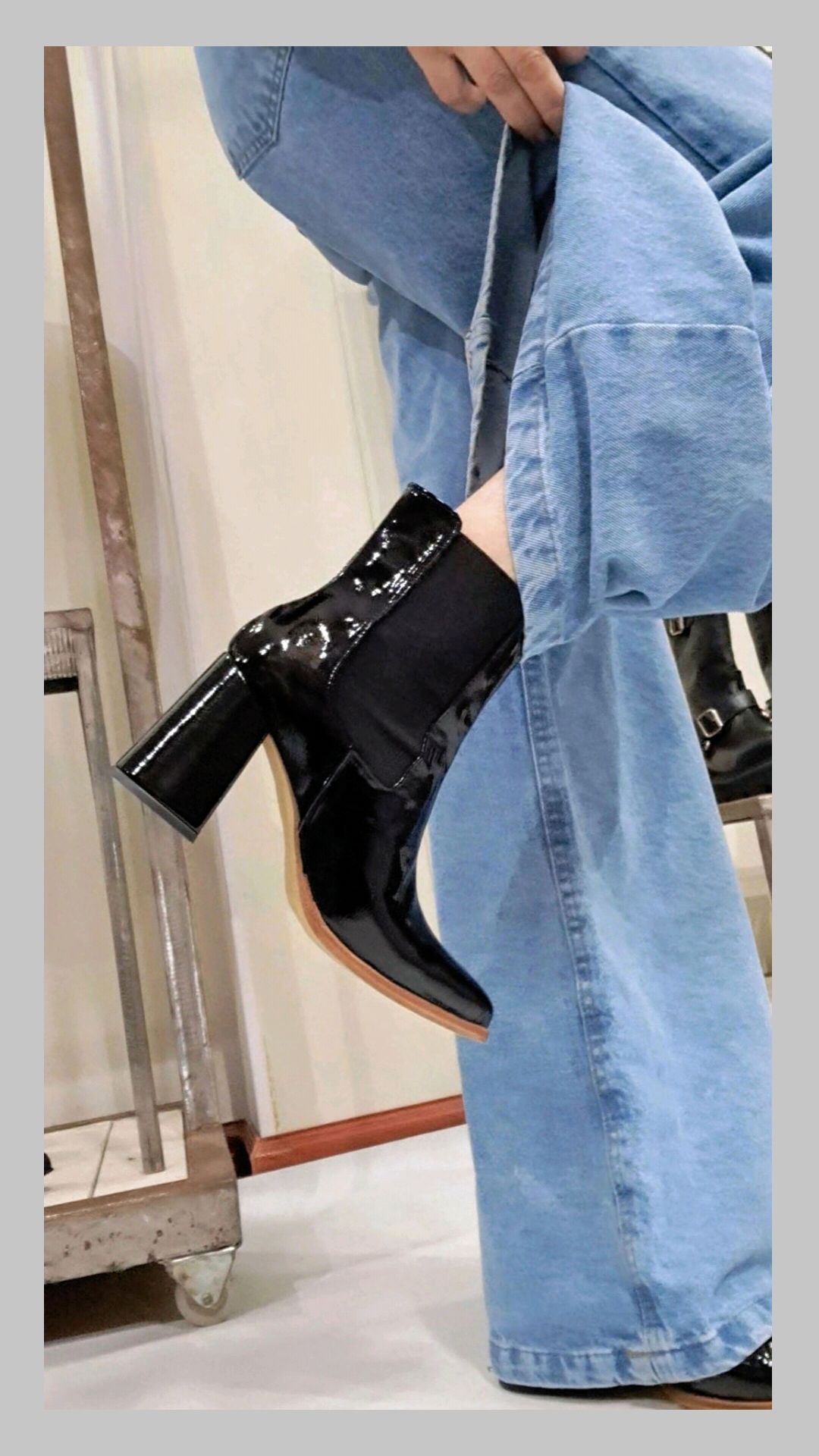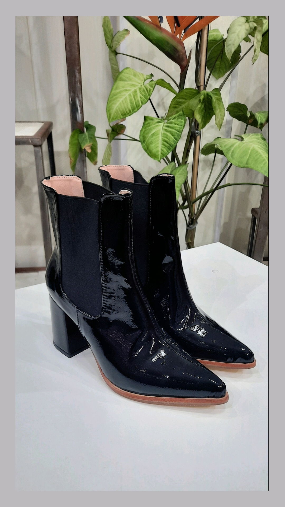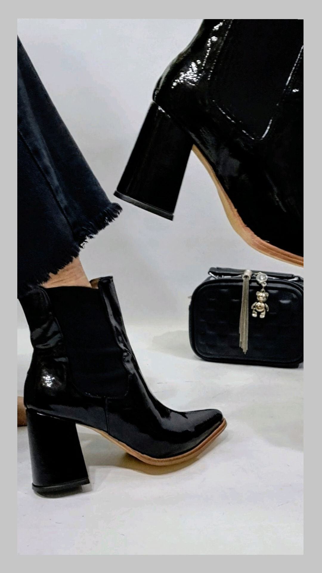 Bota charol quebrado con fuelle elástico en los laterales. Caña 13 cm. Taco 8 cm. Horma normal.