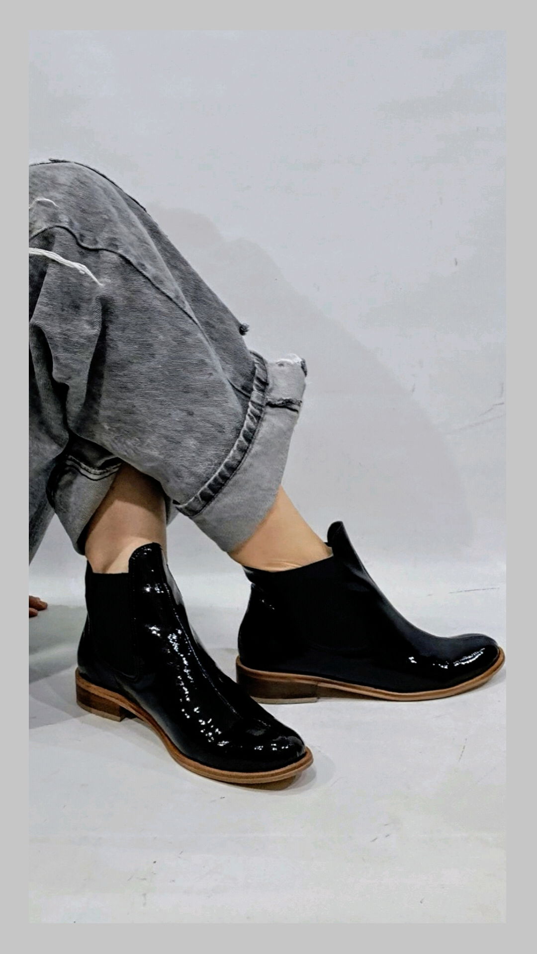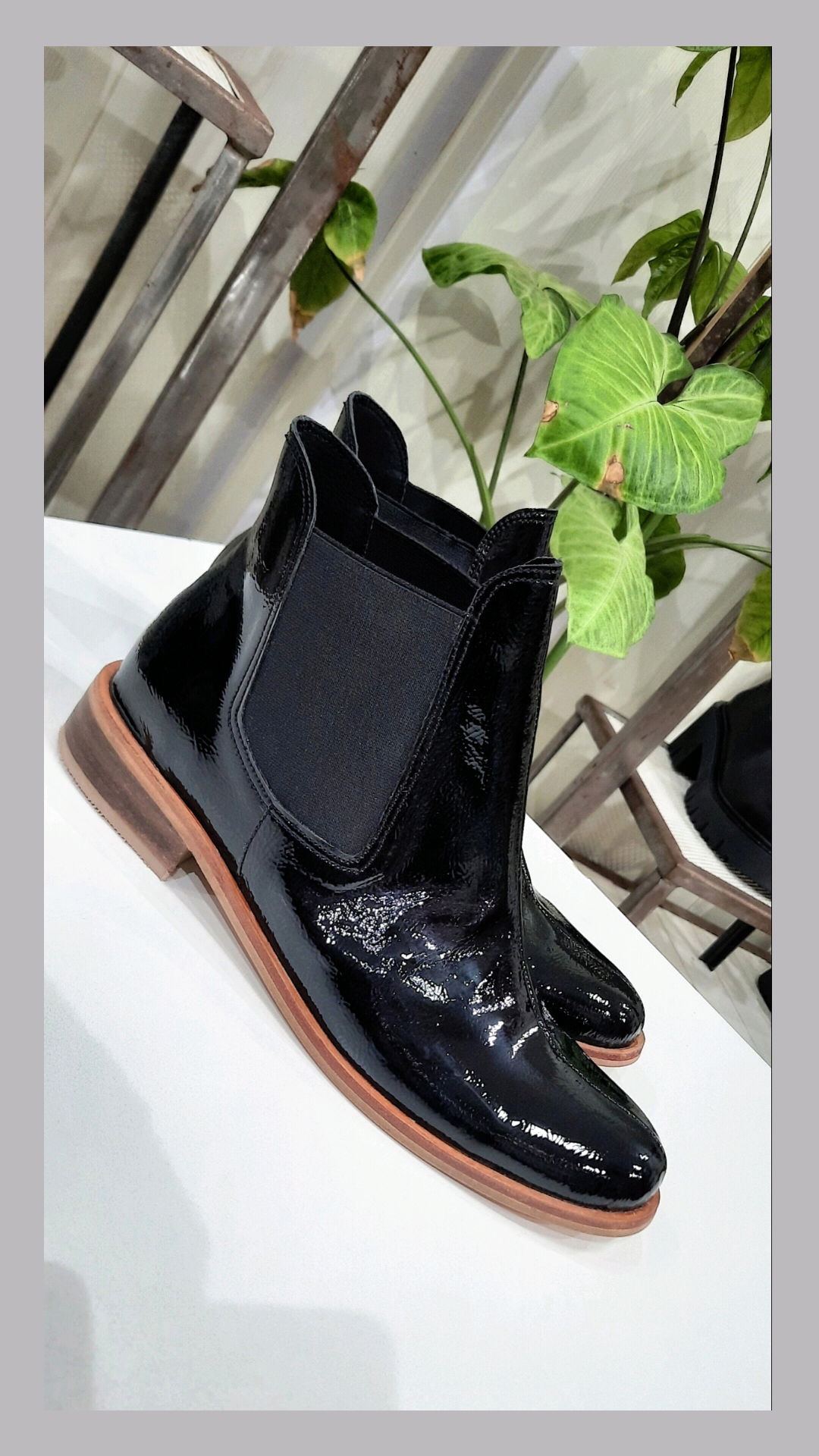 Bota chata de charol con fuelle elástico en los laterales. Horma normal.