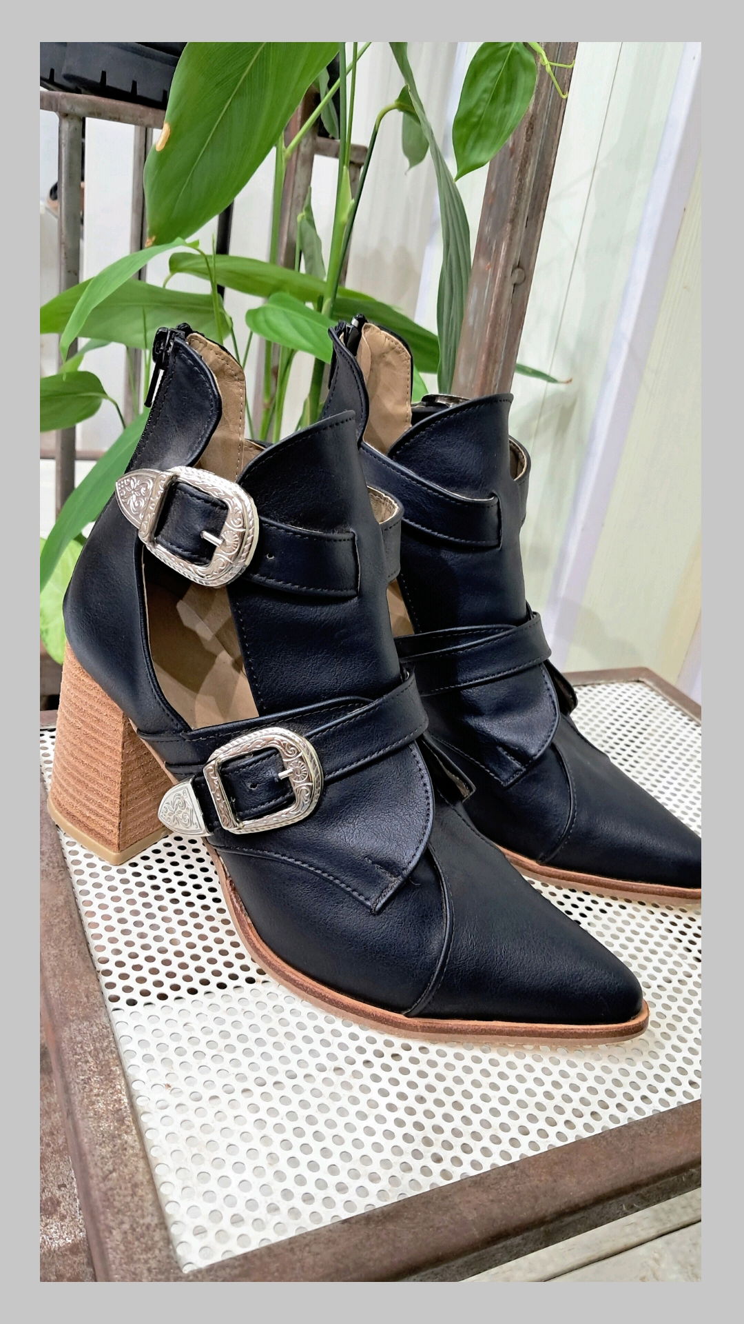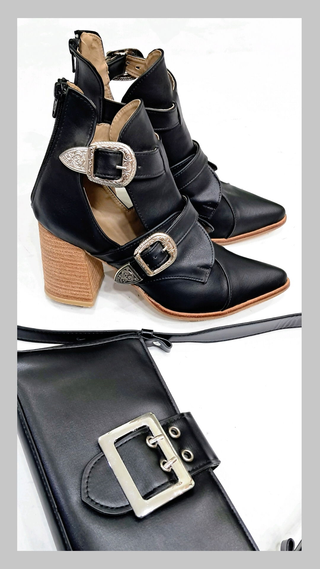 Bota con con hebillas tejanas y cierre en la talonera. Taco folia de 8 cm. Horma ajustada.