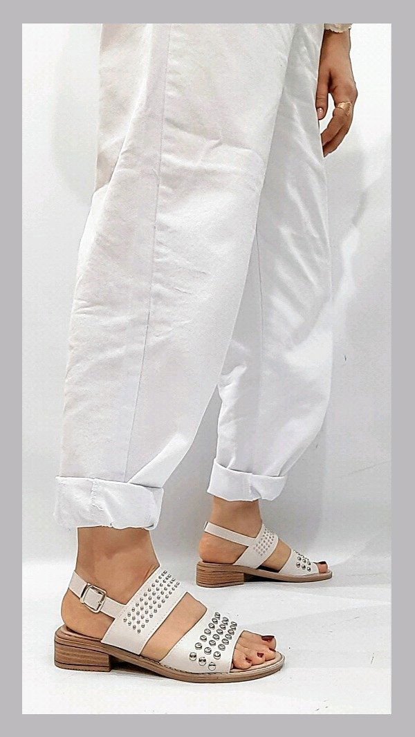 Sandalias ecocuero con tachas y taco foliado de 2 cm. Horma normal.