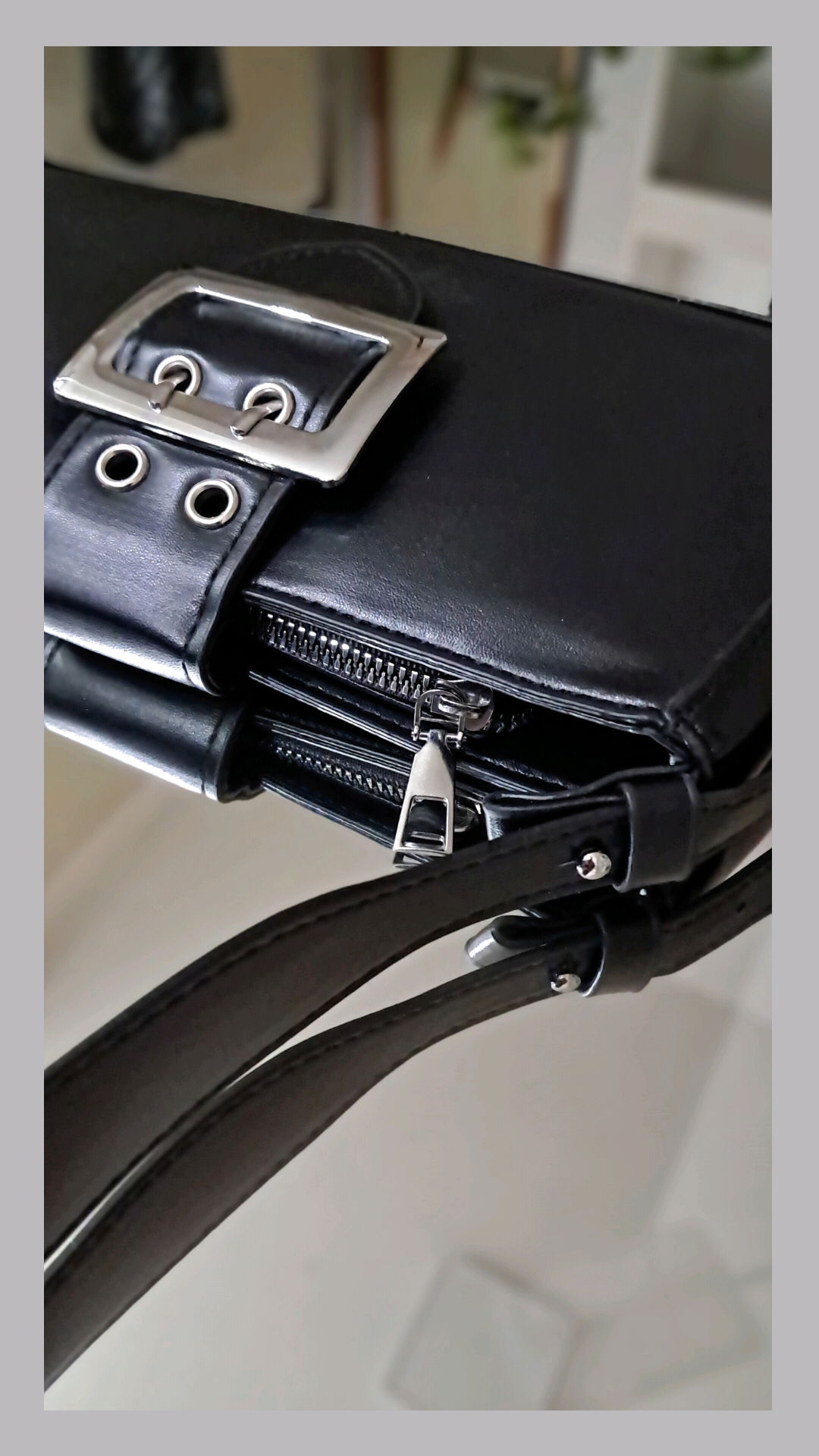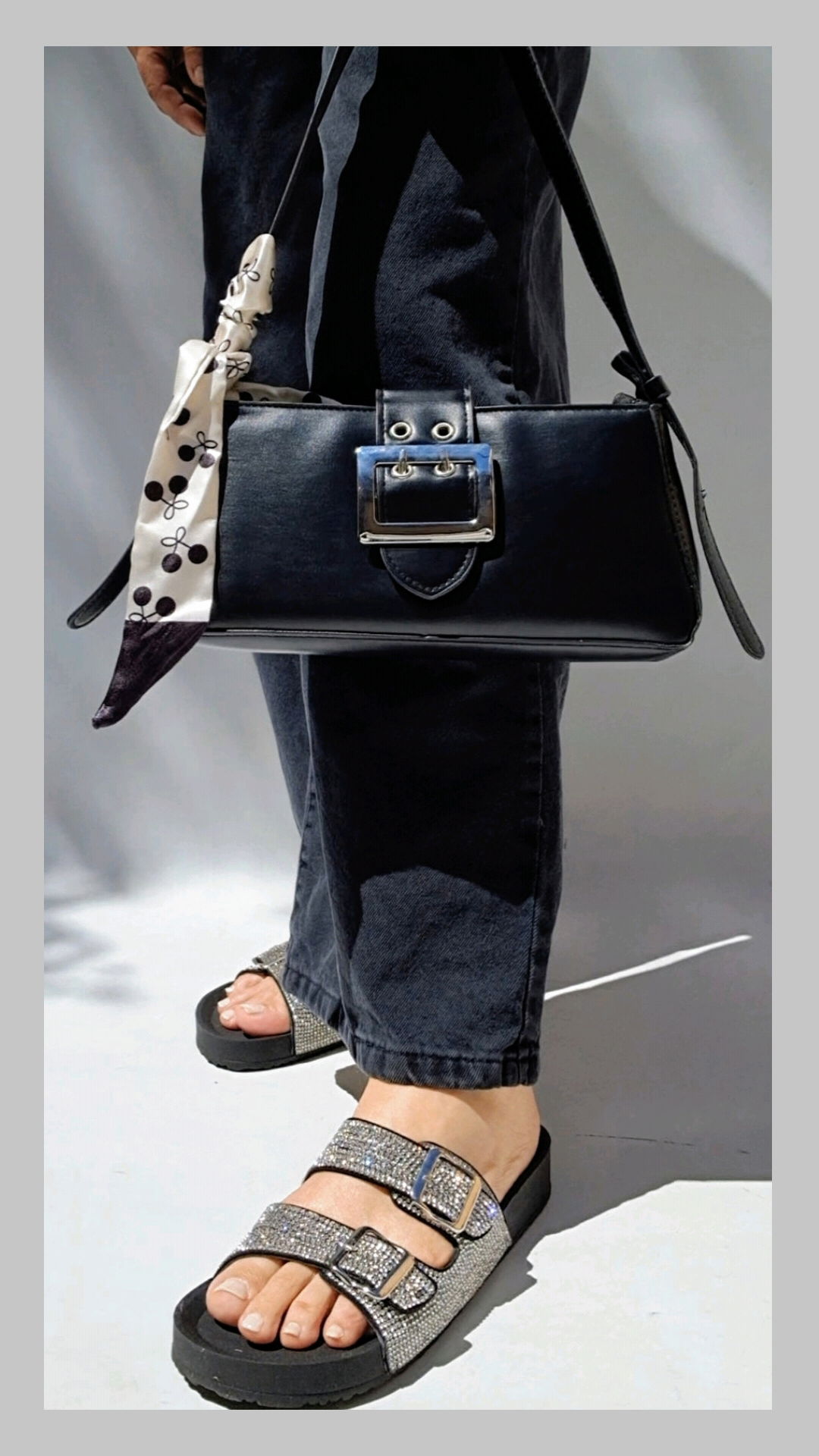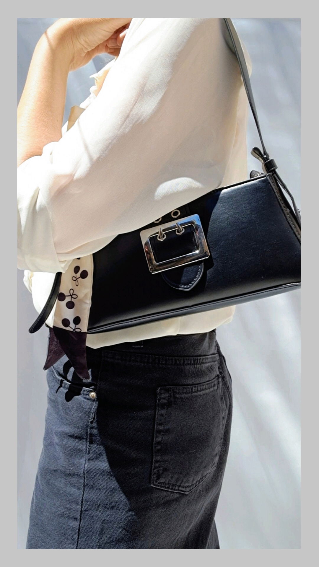 Minibag ecocuero con correa regulable, cierre interno. Incluye pañuelo como accesorio. Medidas alto: 12 cm/ ancho: 26 cm./ base: 5 cm.