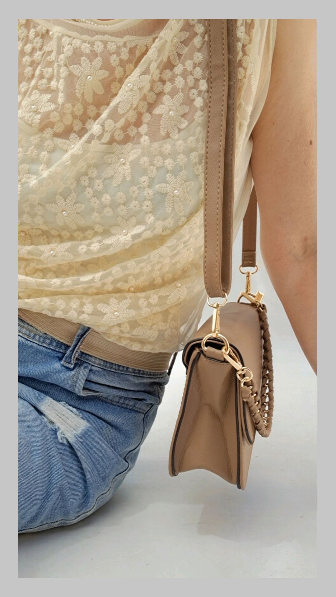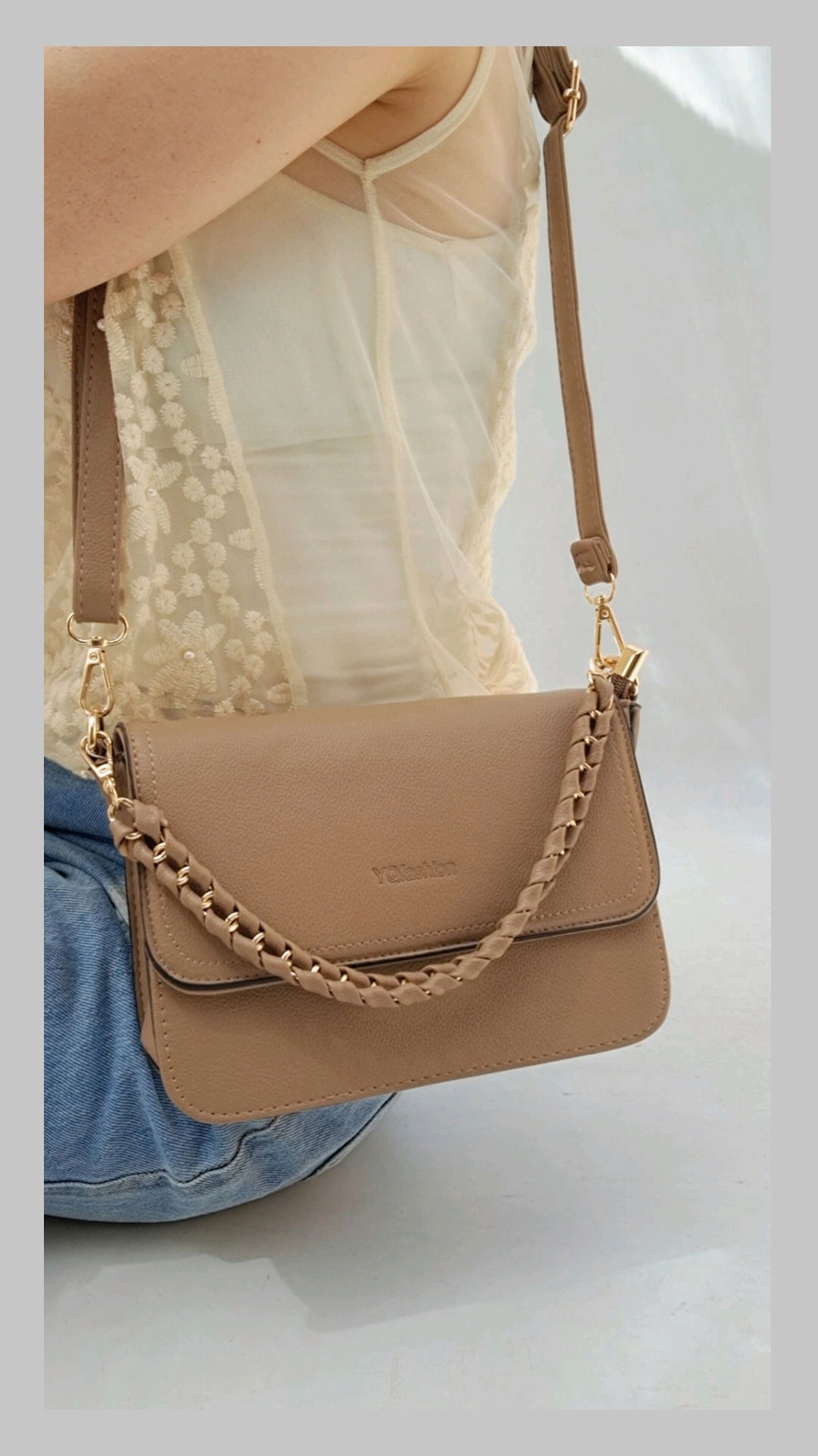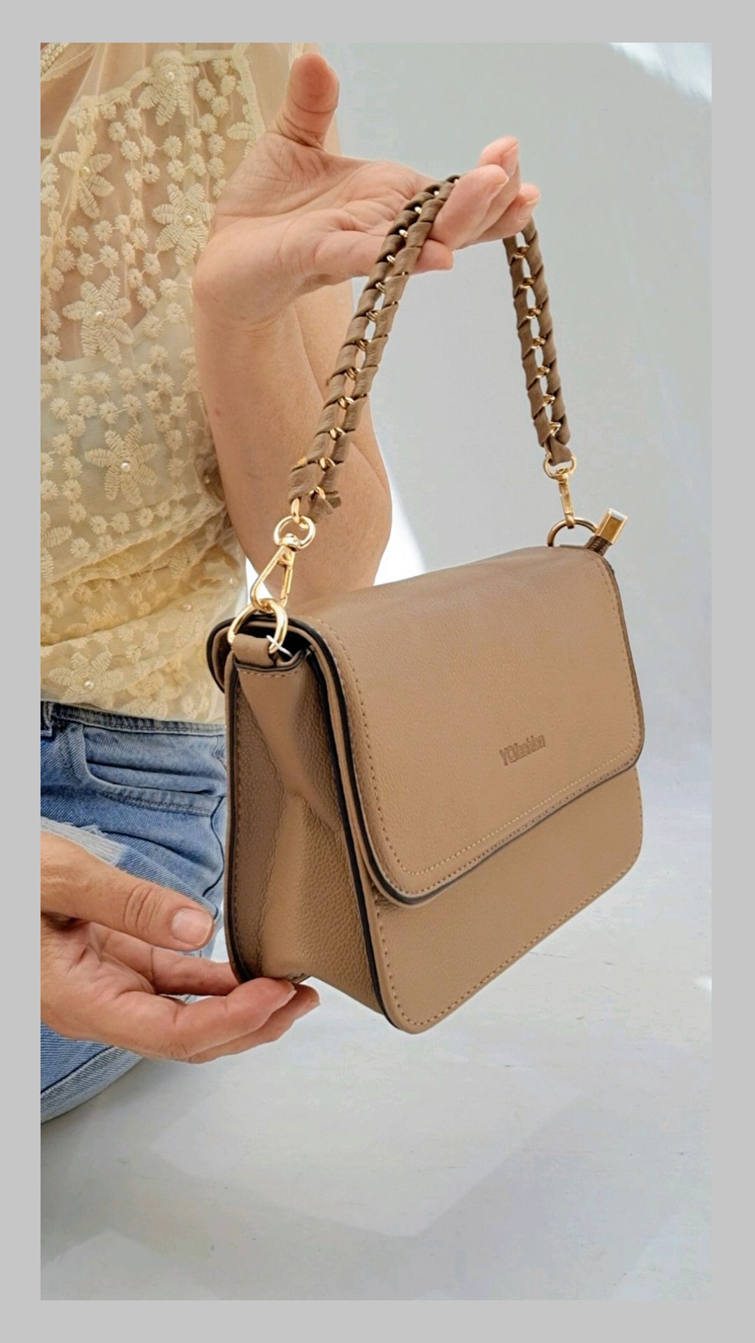 Minibag ecocuero con doble correas desmontables. Correa corta de cadena forrada trenzada.