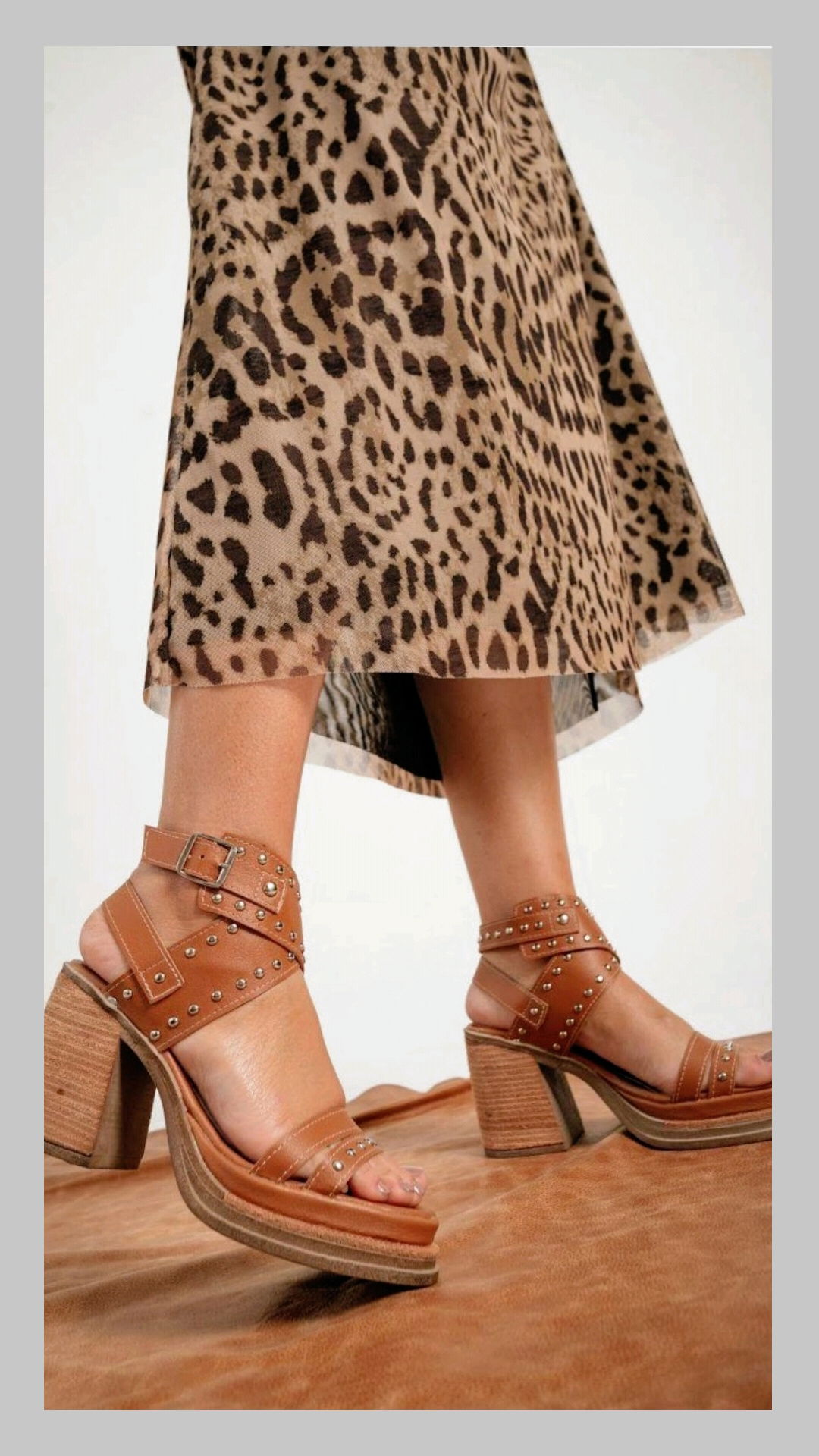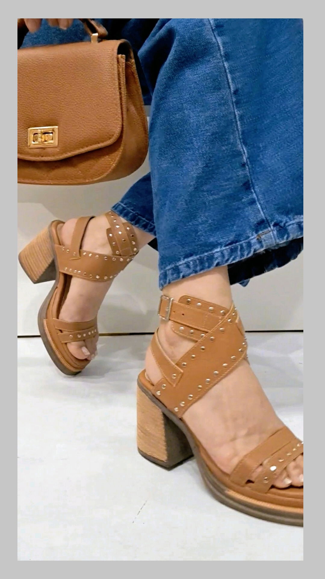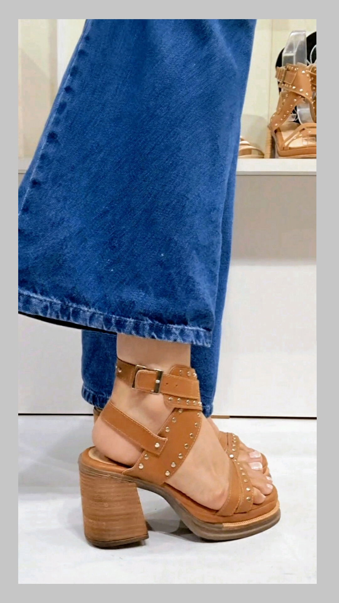 Sandalias con plataformas de ecocuero. Cruzadas con tachas. Ajuste en el talón. Horma normal.
