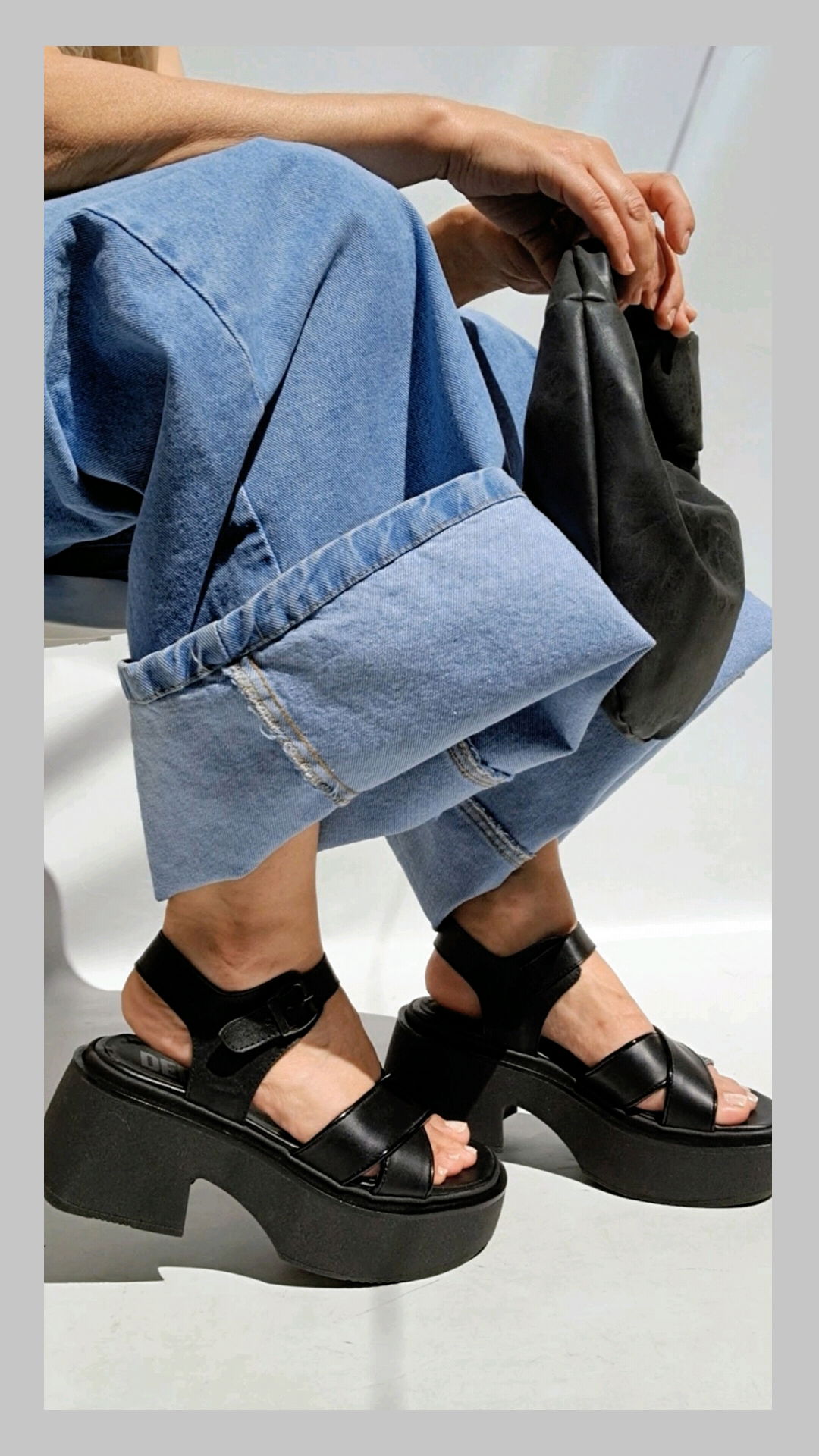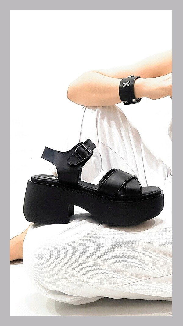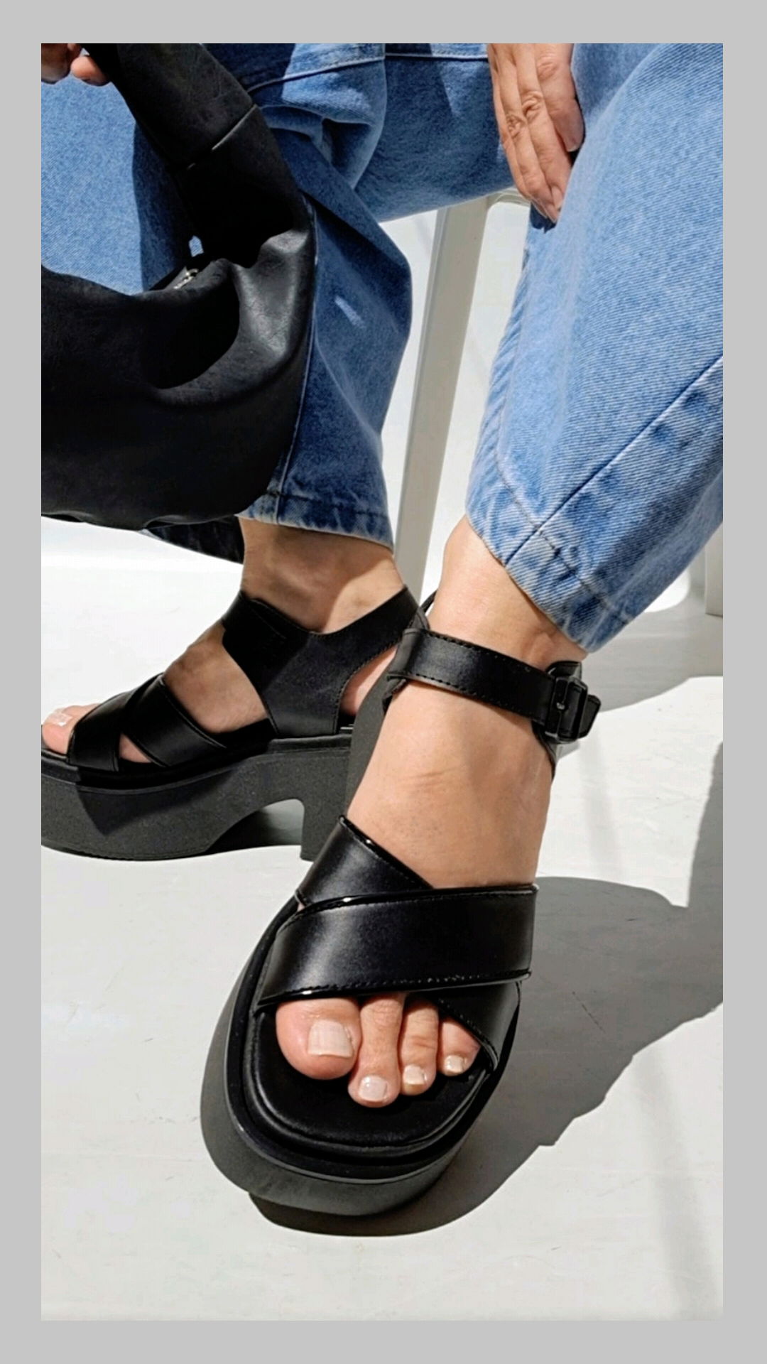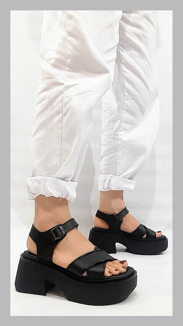 Sandalias con plataformas partida. Taco de 8 cm. Horma normal. Material ecocuero.